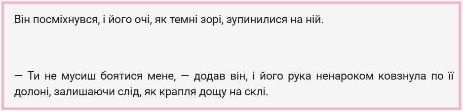 Проте авторка не дає однозначної відповіді, ким насправді є Богдан. Для Ріти він таємничий чоловік, що ніби бачить у ній більше, ніж бачать інші. Його слова «ти не така, як усі» звучать як класичний червоний прапорець: вони водночас лестять і підштовхують Ріту до ролі «обраної». Чи не буде молода жінка у цій грі у ролі жертви?