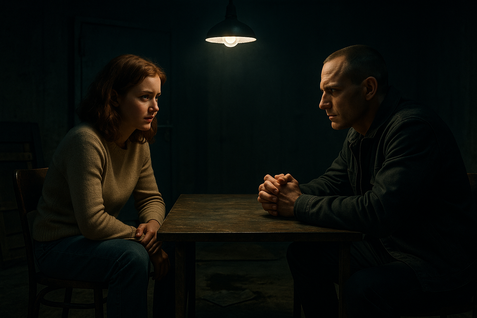 Андреа сидить на старому стільці. Руки вільні, але за спиною — важкі двері з засувом. Вона не спить уже кілька годин, і пальці стискають поділ светра, щоб не змерзнути.