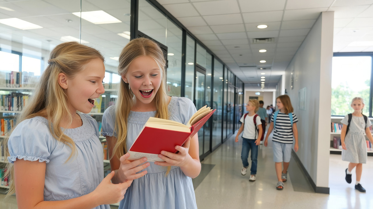 /Подружки-білявки, під час шкільної перерви, спільно обговорюють вельми кумедний епізод з «Вулиці Музичної», бонусний малюнок/