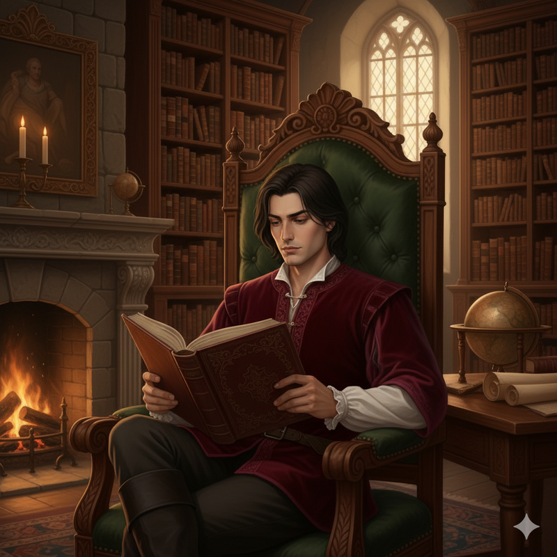 Більшість полиць займали господарські зшитки із записами купівлі-продажу земель, маєтків та людей і облікових записів. Видавалось, що Орест занадто переймається навіть мідяками. Але що справді зацікавило Демитрія – товсті фоліанти, оправлені у фарбовану в червоне шкіру, із металевими кутниками і тисненим зображенням золотого дракона. Родовід Ореста і всіх кровних членів клану.