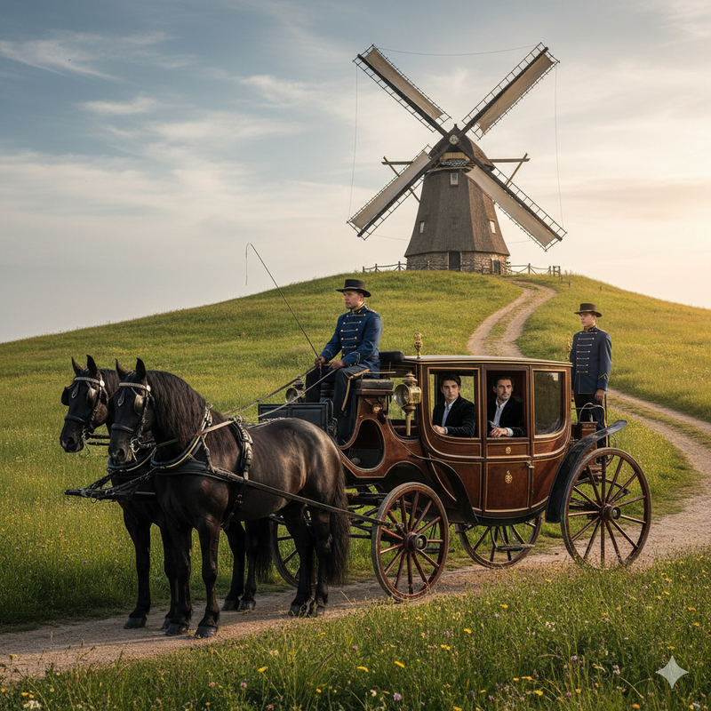 Карета зупиняється біля підніжжя невеликого пагорба, на вершині якого розташований вітряк. Саме туди я багато років тягав візок із зерном і пригальмовував віз із борошном, спускаючи його по пагорбу вниз… З тугою оглядаю такі знайомі мені місця, де пройшло моє дитинство і юність…