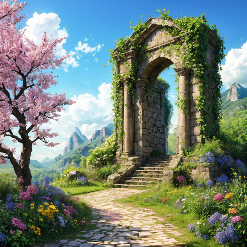 — А цей пейзаж тобі знайомий? — я простягнула Ерінвальду останній малюнок, яскравий, весняний. На ньому була зображена напівзруйнована арка з колонами, увита плющем, а перед нею росла квітуча сакура. І всюди, всюди радували око своїм різнобарв’ям квіти!