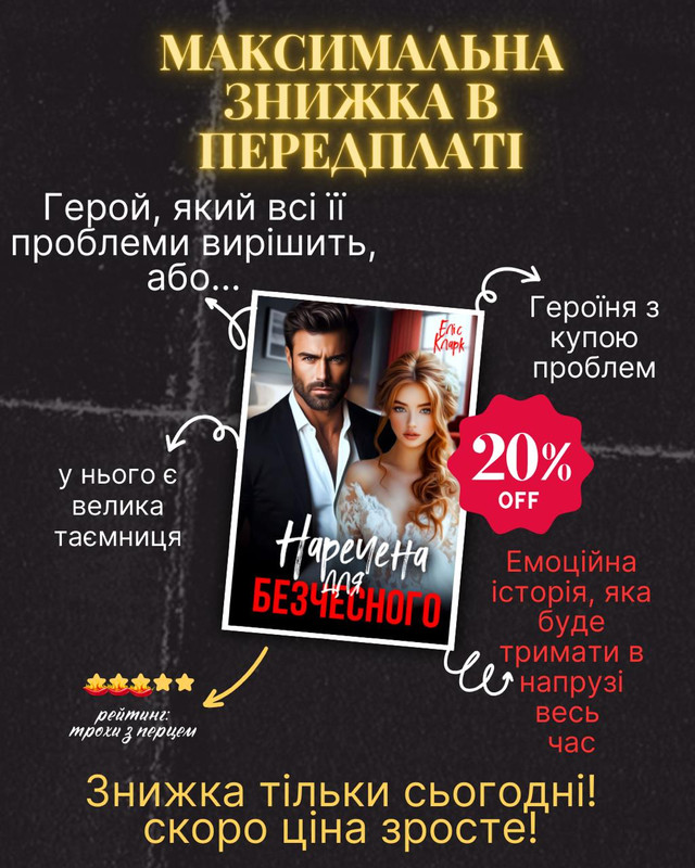 Купуйте книгу "Наречена для Безчесного" за мінімальною ціною, поспішіть, бо вже завтра ціна зросте, тільки до півночі цей роман можна придбати усього за 47 грн!