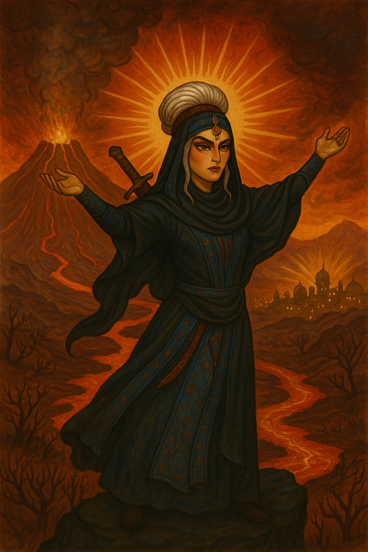 Одночасно з цим, в місті, на вершині тонкого шпиля мінарету мас'джиди Файроса спалахує яскравіше Вічне Полум'я Іл'Нуру, підіймаючись до самісінького неба й утворюючи багряну заграву, коли його язики змішуються із першими сонячними променями. На самому верхньому балконі мінарету з'являється фігура джет'хери, головної жриці Вогняного Бога, одягнена у біло-червоно-золоті шати, чия голова оповита шовковою чадрою, прикрашеною вінком з палаючих справжніх квітів маветії, сакральних для всіх вірян Ватро'Назу. На нижчому балконі так само неквапливо виходить до міста муйєдзін, теж жрець,але який справляє служби виключно для чоловіків в цьому матріархальному світі. Джет'хера і муйєдзін одночасно широко простягають руки до сонця і далекого вулкану, потім охоплюють ними весь Мостар-Ґрад, немов хочуть поділитися енергією дикої природи із кожним жителем. Далі зі складок їхнього вбрання з'являється книга із сяючими вогняними символами, священний Корі'Тан, який жерці розкривають на конкретній сторінці, а потім джет'хера заводить красивий спів, хвалу Світозарному Богу, Ресулу Його, Філішні та Мучениці Маріфет, одночасно з цим закликаючи своїм чистим прекрасним голосом всіх вірян відгукнутися на заклик езану й прибути на обов'язковий мевлуд до підніжжя мінарету, щоб справити належну седж'ду Богу над Богами й подякувати йому за новий день.