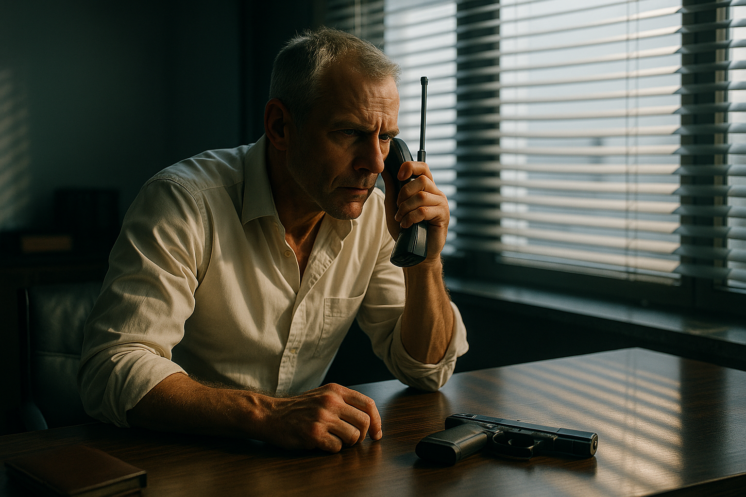 Райзманн зупиняється. Відчуває, як руки починають трястися. Він дістає пістолет з шухляди, кладе на стіл.