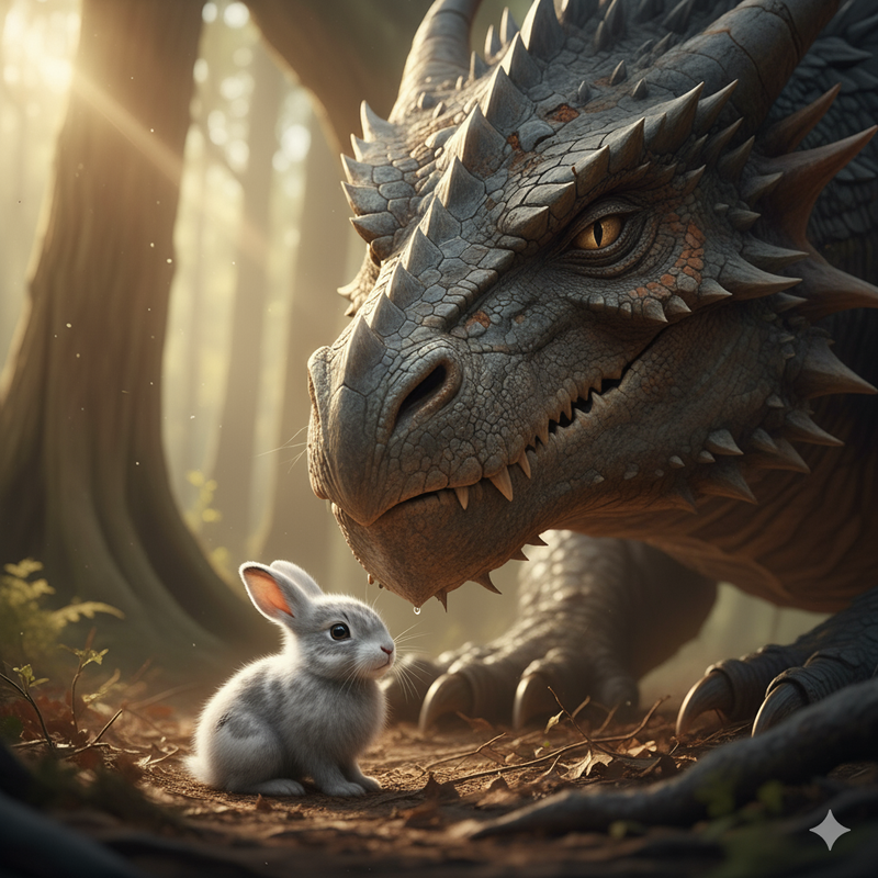 Вранці мене будить якийсь шурхіт біля моєї морди. Розплющую очі: прямо переді мною сидить зайченя. Пухнастий клубочок довірливо дивиться на мене своїми чорними оченятами… Мені реально треба тільки відкрити пащу, зробити різкий кидок, і мій шлунок перестане болісно стискатися та бурчати від голоду. Але… я не можу цього зробити… Тільки не дитинча…