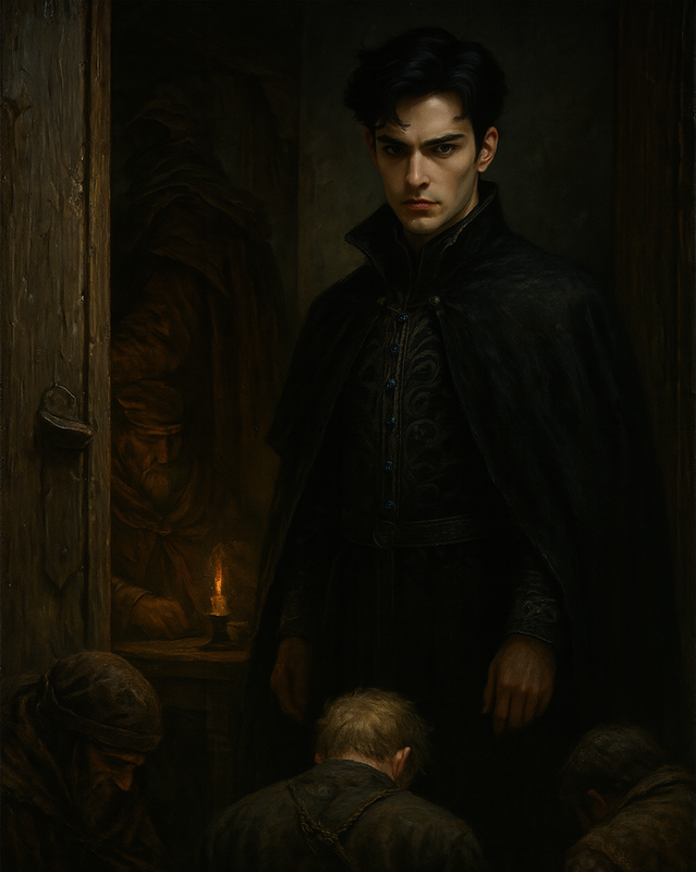 Із задніх дверей трактиру зайшли двоє кремезних чоловіків, тягнучи за собою зв'язаного хлопця, зовні років тридцяти.