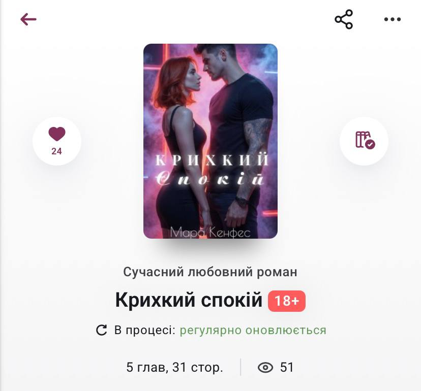 Також моя найбільша любов (поки що) "КРИХКИЙ СПОКІЙ" має вже 50 переглядів та 24 сердечка (книга в процесі написання, завтра вийде новий розділ ☺ пі-пі анонс):