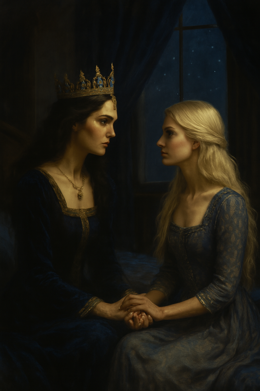 Королева сіла на ліжко поруч з дочкою і обійняла її.
