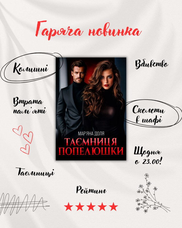 Запрошую вас до своєї новинки під назвою "Таємниця Попелюшки"!Це романтичний детектив, у якому ми знову зустрінемось з детективом Юліаном Хмельницьким і його партнеркою Ларисою Скоропадською!