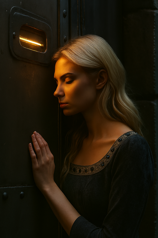 Вона йшла вперед, намагаючись не видавати зайвих звуків. Золоте сяйво линуло з маленького віконця вгорі дверей. Зараз це віконце було зачинене, та вирізане воно було неточно і тому шпаринка розміром з нитку пропускала світло.