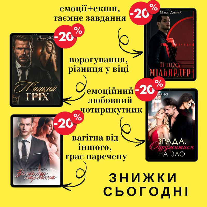 Якщо вам стало цікаво, що поєднує цих двох таких несхожих людей, запрошую до мого роману "ВАГІТНА НАРЕЧЕНА"! Сьогодні на цю книгу діє максимальна знижка, і її можна придбати за мінімальною ціною - всього 47 грн!