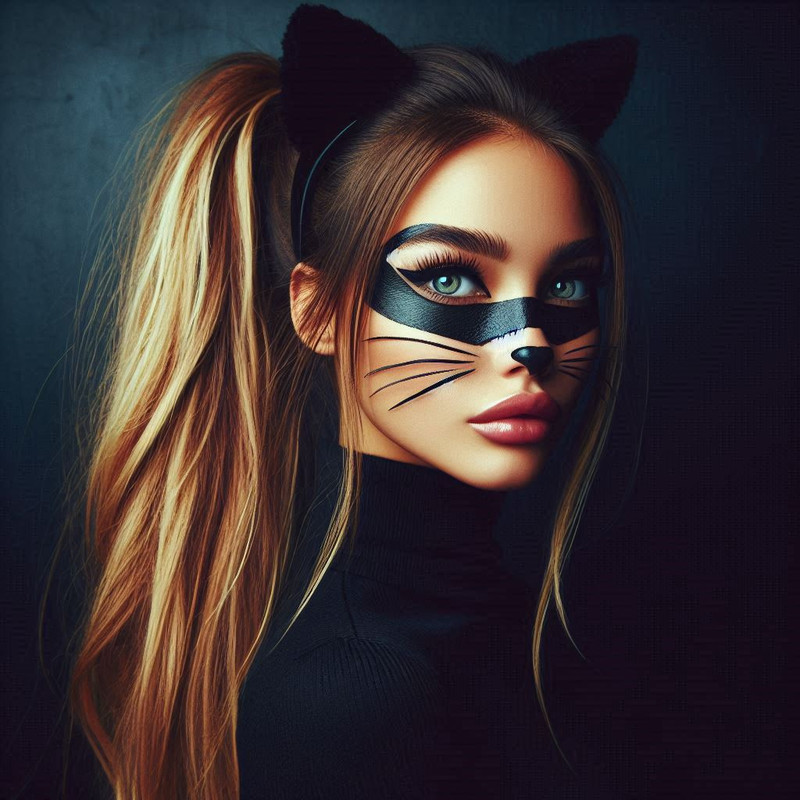 Бастет — щодо цієї героїні думати довго не довелося. Її ім’я говорить саме за себе: Бастет — давньоєгипетська богиня, яку зображували як жінку з головою кота або повністю в котячому образі. Тому я дала ШІ відповідний запит, і вийшов костюм сміливий, яскравий, що підкреслює її рішучість та харизму.