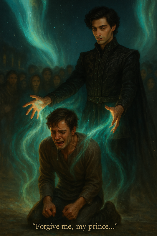 Полярне сяйво променями полетіло до чоловіка, змусивши його стати навколішки. Хтось у натовпі верескнув. Чоловік тремтів всім тілом, сльози стікали обличчям, а голос тремтів від страху.