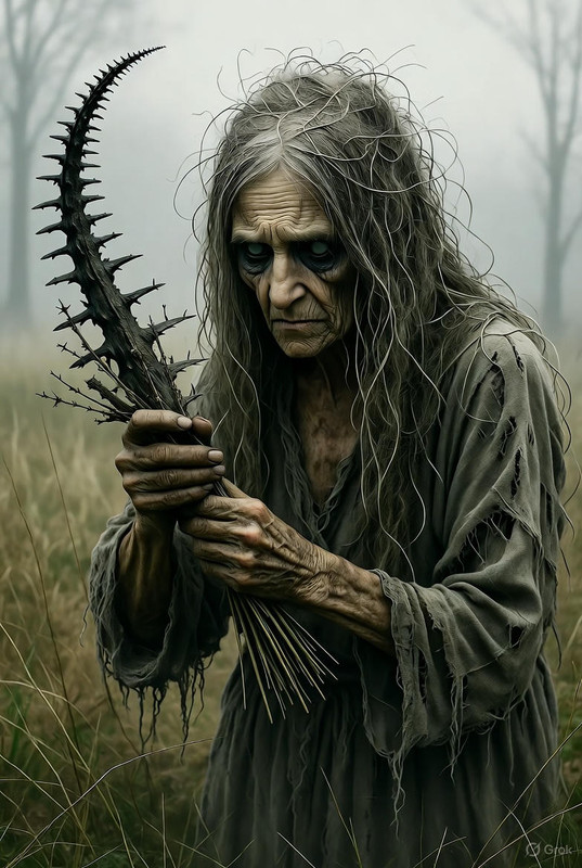 Він кликав Елайну, голос його розривав тишу — спочатку голосно, з надією, що відлунює крізь гілки, а потім тихіше, надривніше, бо відповіддю був лише вітер. Сухий, колючий, з присмаком попелу, наче дихав з попелища давно згаслого вогню. Вітер цей не гудів, а шкрябав по шкірі, ніби пальцями з тріскучими суглобами, і в його подиху ховалася якась дивна обіцянка — не свободи, а пастки, що затягується непомітно.Раптом з-за покрученого куща, що стирчав із землі, наче зламаний хребет якоїсь давньої звірі, випросталася постать. Стара баба в сірому лахмітті, що злилося з туманом, ніби вона виросла з нього сама. В руках у неї тремтів вузлик трав — сухих, скручених стебел, що пахли гіркотою й чимось отруйним, наче зілля, варене над вогнем з людських кісток. Волосся її було не просто сивим — воно скидалося на сухий мох, що обвисав пасмами з голови, чіпляючись за плечі, і шелестіло при кожному русі, ніби шепотіло забуті прокляття. Очі — каламутні, наче вода в стоячому ставі, де тоне все живе, але в їхній глибині блищали живі іскри: насторожені, хижі, ніби в вовчиці, що вичікує здобич у сутінках.Вона щось шепотіла, перебираючи стебла пальцями — довгими, зірчастими від бруду й трави, — і слова її губилися в тумані, наче дим від тліючого вогню. Не підводячи погляду, вона сказала, і голос її був хрипким, як скрип гілок у бурю: