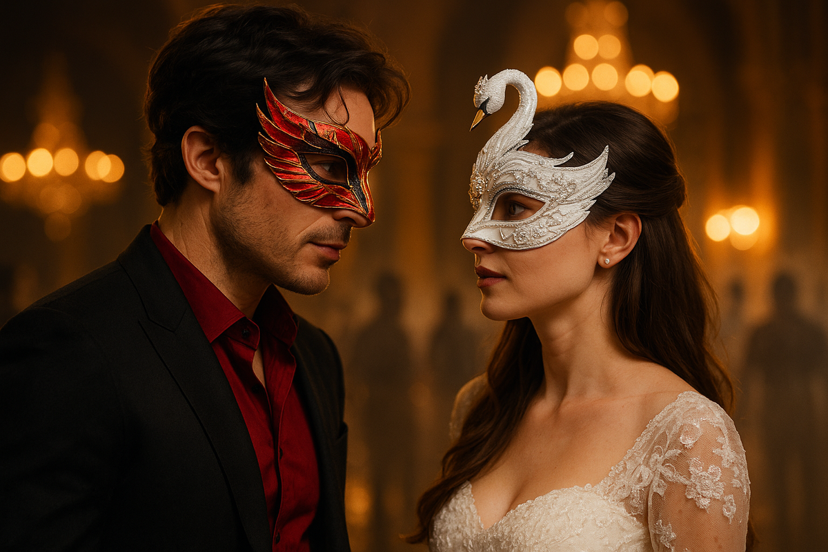 Ось Максим і Дана з “У темряви сірі очі”. Максим вдягнув маску фенікса, що символізує його шлях від темряви до світла і відродження. А Дана в образі білого лебедя, що символізує чистоту її душі та доброту.