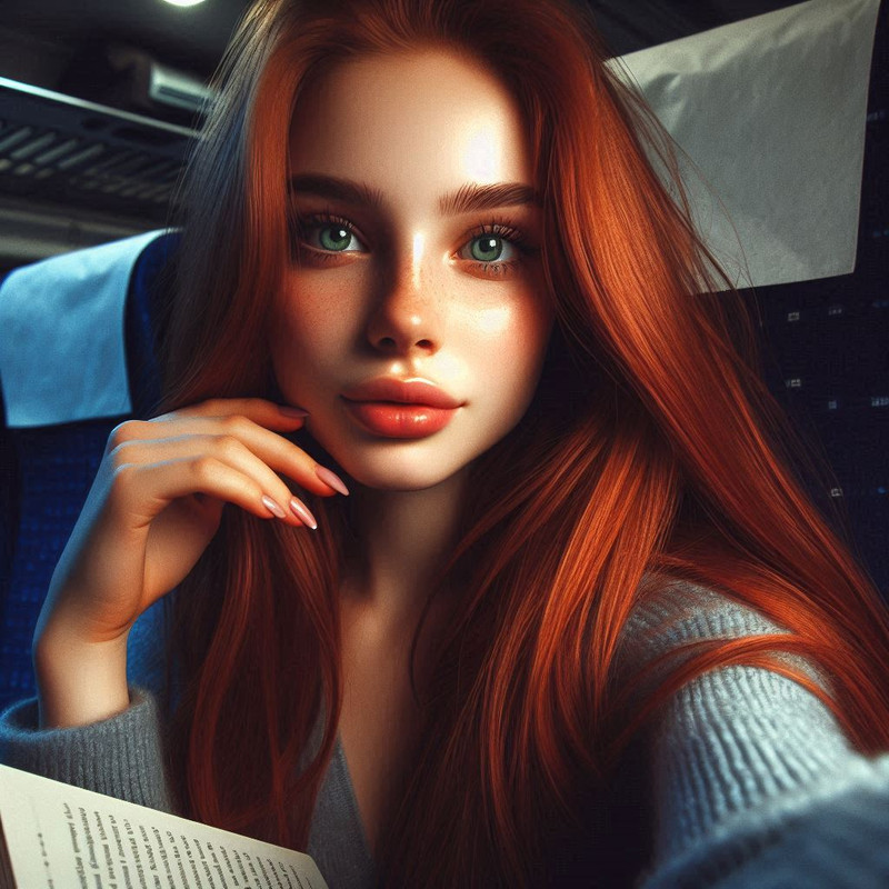 - у вагоні потяга, з книжкою в руках;