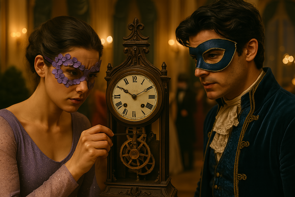 Дейлан пирхнув зі сміху. Калісса щось підкрутила і зачинила панель. Годинник знову пішов. За кілька хвилин пробило дванадцять ударів і залу заполонили магічні видива: пари, що танцювали у повітрі, зорі і галактики, що пурхали між гостей, напої набували дивовижних кольорів: від пурпурових, до глибоких синіх. У залу вдихнули магію і гості захопливо зітхнули.