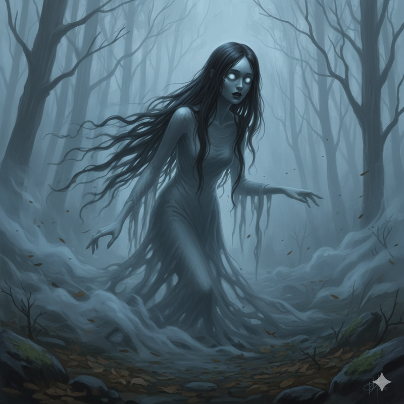 І раптом із мли виступив силует. Прозорий, як тінь. Довге волосся спадало, мов мокрі водорості, а очі — сріблясті, без зіниць. Уста ворушилися беззвучно, але я чула кожне слово так виразно, наче вона шепотіла просто у вухо. Це була не моя мати, але її голос.