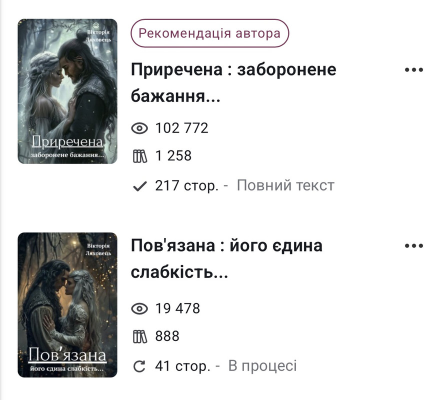 Для когось це небагато, а для мене — ціла подія. Такі цифри неймовірно мотивують і піднімають самооцінку: відчуваєш, що дійсно створюєш щось цікаве й потрібне, що недаремно витрачаєш час. Тож, хто ще не читав — запрошую вас на мою сторінку до ніжного, емоційного любовного фентезі – Приречена : заборонене бажання... . воно точно не залишить ваше серце байдужим.