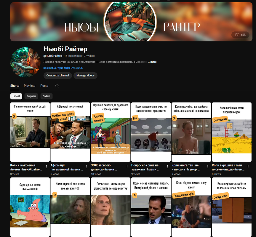 Так що заглядайте на мій канал “Ньюбі Райтер” та підписуйтесь - буде весело, творчо й точно не нудно! Оновлення щотижня!