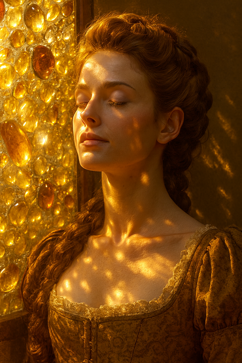 Сонячне світло просочувалось крізь вікно, виконане із бурштину та цитрину, залишаючи на золотих шпалерах яскраві відблиски.