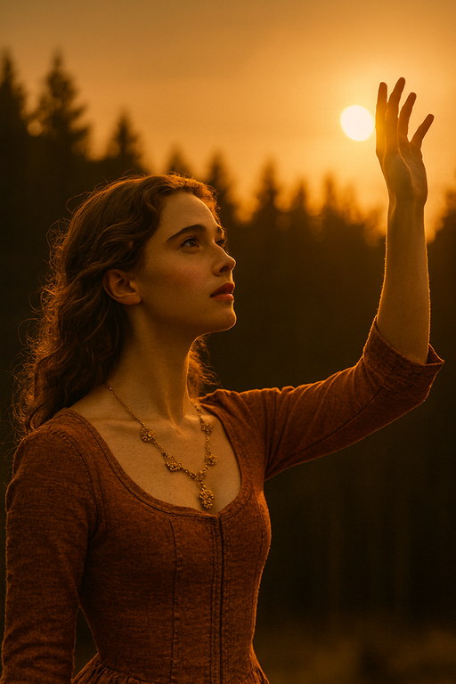 Її рука несвідомо метнулась вгору і небо немов затремтіло. Пальці її напружились і вона повела ними вбік, немов виштовхуючи світило далі по небу. Задихнувшись, вона спостерігала за тим, як сліпуче сяйво котилося до обрію. Рожеві і бузкові смуги вкривали небо. Це був найкрасивіший захід сонця, який вона тільки бачила. Вартові верещали. Ніколи ще світило так низько не сідало. Скільки існувало королівство, сонце ніколи не залишало неба.