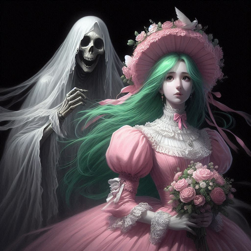 Тут, як бачите ШІ вирішило, що там де сукня, обов'язково має бути шляпка й букет квітів.