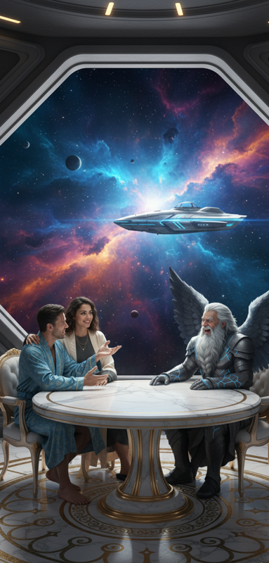 Бог: — Галактична Спільнота бажає більше дізнатися про сюжет спільної книги Адріана Анжелворда та Маргарити Сухиної, «Історія, яка написана (не) нами», але саме очима персонажів книги. Розумієте? Тож, чи готові ви почати?