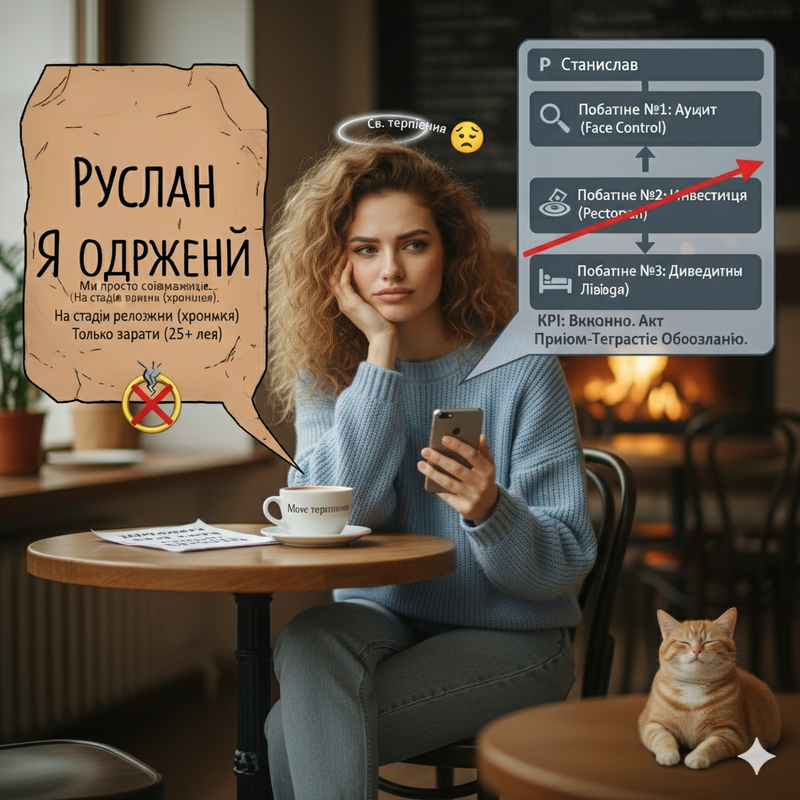 А про себе подумала: може, він мені ще й форму 2-НДФЛ надішле? Чи попросить довідку про несудимість? Щоб усе було максимально офіційно, як у поважного "менеджера з підбору персонала на роль Партнера". Треба було уточнити, чи буде підписаний Акт прийому-передачі виконаних робіт після третього побачення. Це не чоловік, а прямо Департамент Планування та Логістики Одноосібного Кохання.