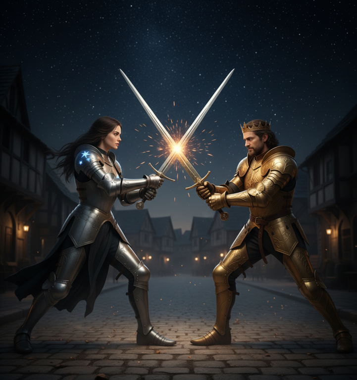 Сафріна стрибнула вперед, випроставшись перед Алариком, вона здійняла підборіддя. Щось зблиснуло в очах короля на мить, а тоді він атакував, Сафріна відбила удар. Срібний і золотий мечі дзвінко зіткнулися.