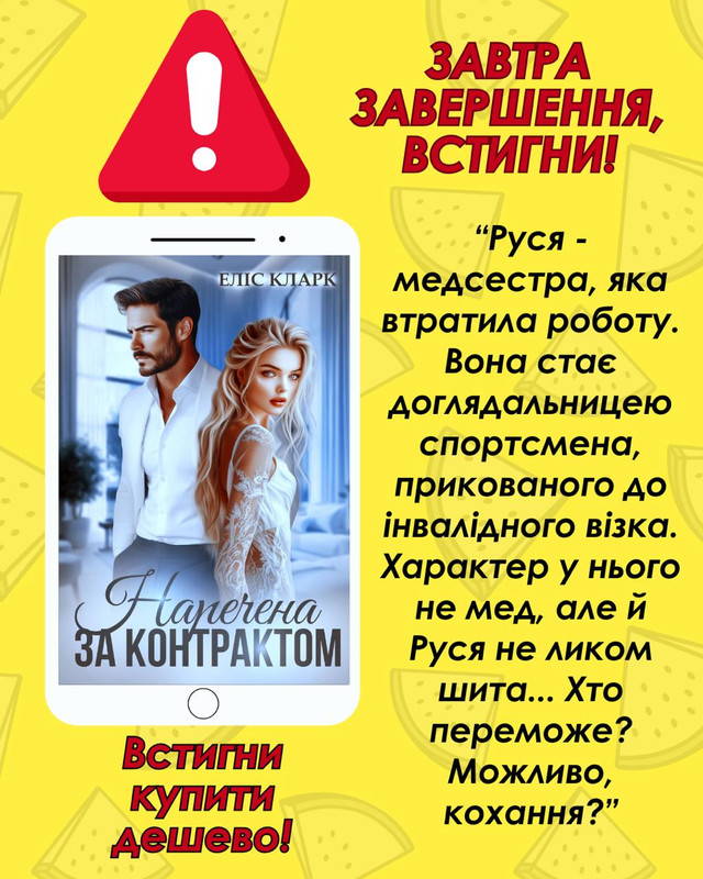 Запрошую до романтичної історії від Еліс Кларк "Наречена за контрактом"! Це бестселер Букнету, який уже купили майже 500 читачів! Вже завтра книга набуде статусу завершеної... Тож прямо зараз, не відкладаючи, ви можете купити завершену книгу за ціною передплати!