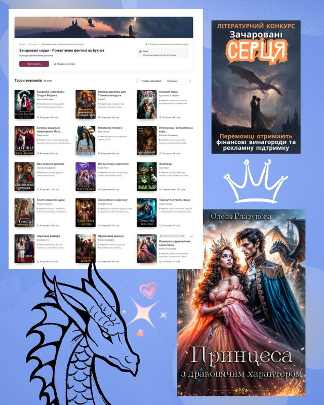 Запрошую до мого конкурсного твору «ПРИНЦЕСА З ДРАКОНЯЧИМ ХАРАКИЕРОМ» там якраз починають розкриватися таємниці. Цікаво, як принц зможе провести ніч у палаці в жіночому одязі та що дізнається принцеса про мітку істинної пари? Куди поділася ревнива кажанка Бетсі? Чому міністр Гімнеус вештається коридорами королівського палацу?