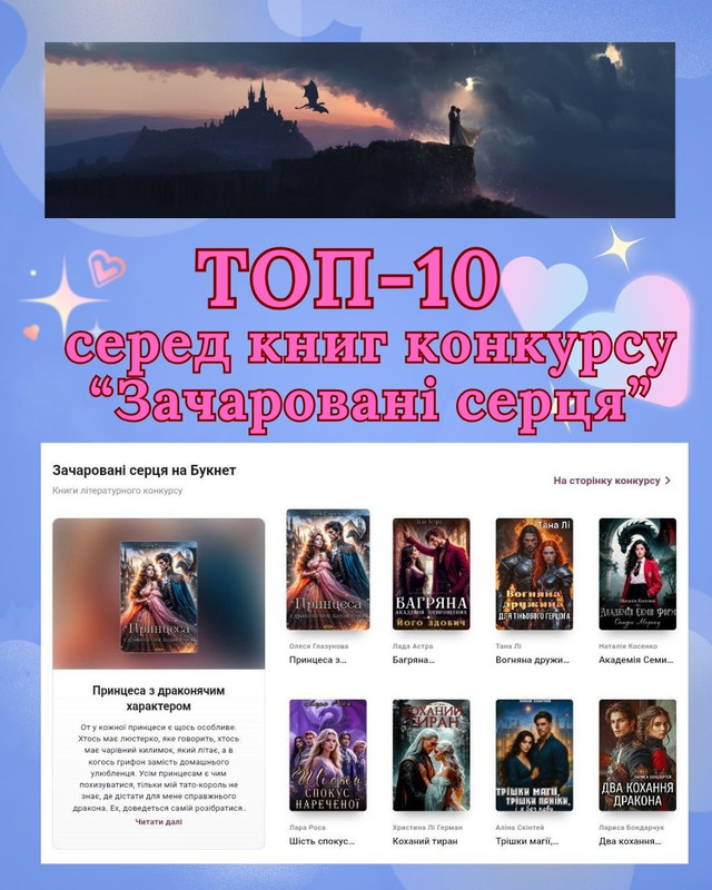 Сьогодні ви зробили мій вечір! Моя книга «Принцеса з драконячим характером» бере участь у конкурсі романтичного фентезі «Зачаровані серця» і сьогодні вона опинилася на 10 позиції. Для мене це ВАУ! Для мене це перша велика книга у жанрі фентезі, в мене не так багато підисників, але 10 місце серед 97 книг!!!