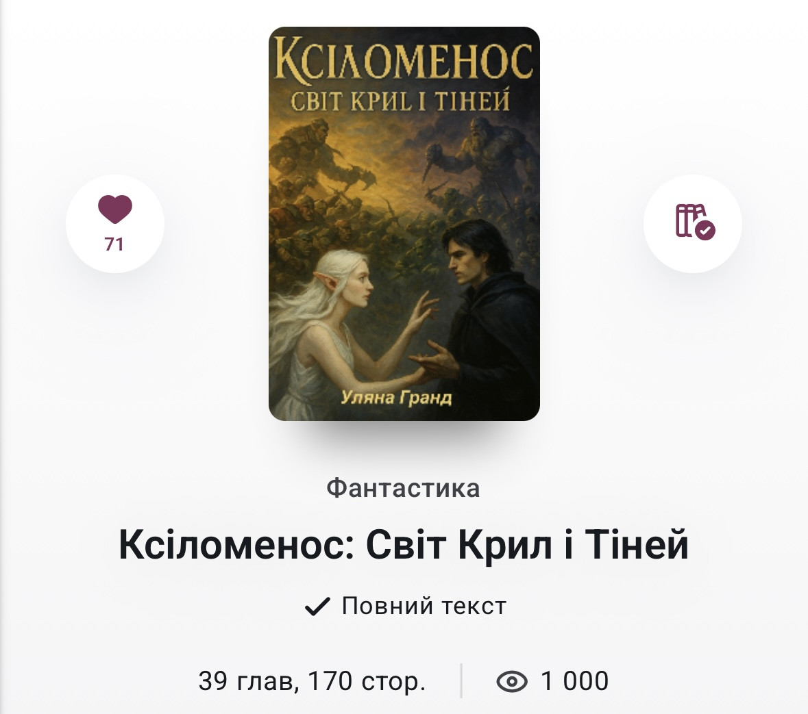 Друзі, сьогодні хочу поділитися з вами чудовою новиною — моя книга «Ксіломенос: Світ Крил і Тіней» перетнула позначку у 1000 прочитань!