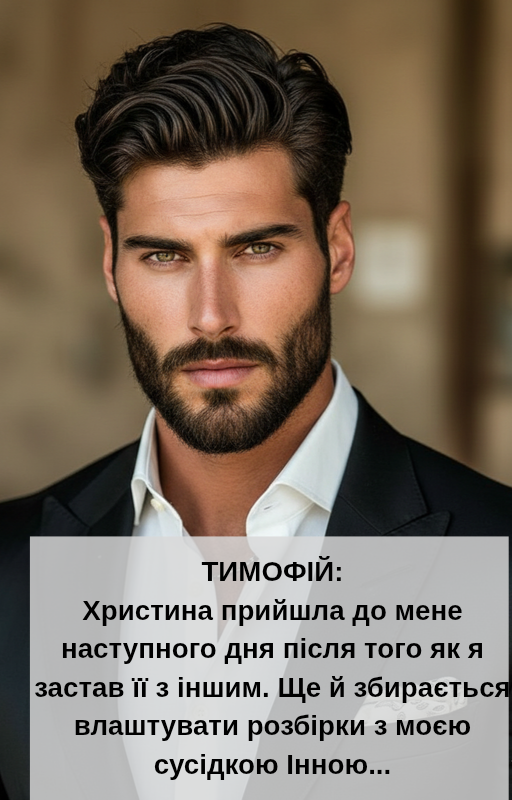 — Щоо? — протягує Христина, її очі ледь не вивалюються з орбіт. — Сусідка кличе?! Що у тебе з нею? Мене тільки тиждень не було... То ось чому ти її мені у приклад ставив... Ти кретин останній. Зараз я поговорю з цією адвокатесою. Я їй розкажу, як до чужих чоловіків чіплятися. — Розвернувшись, Христина йде вниз, а я кидаюся за нею.