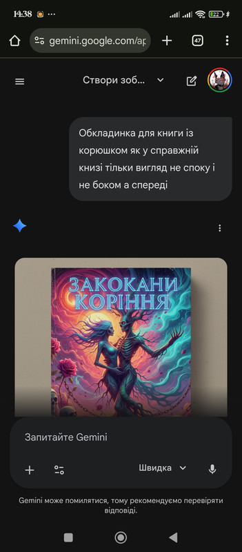 А потім я додатково вирішила спробувати ще чи вийде в мене створити також обкладинку для книги скорішком через gemini вийшло мені сподобався як варіант GPT так і джиміні тому далі який вам більше сподобається.