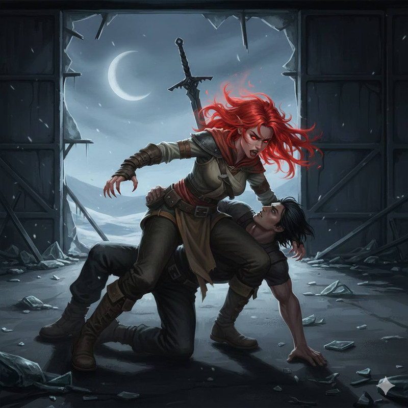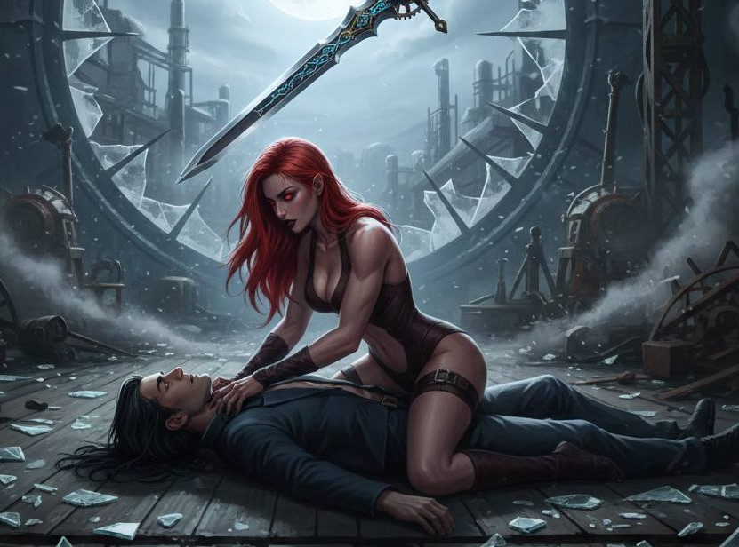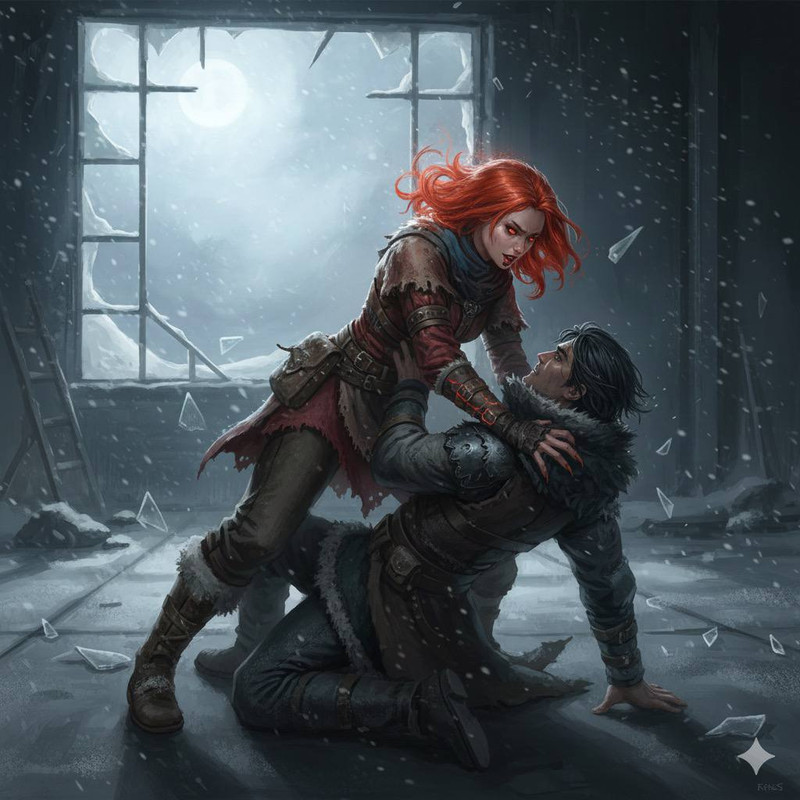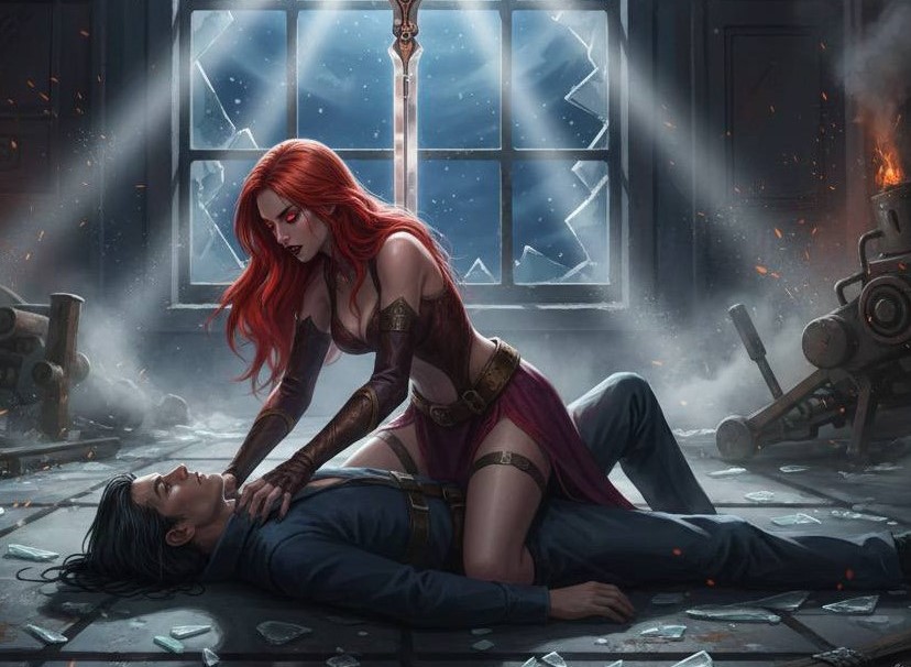 Як спеціаліст зобразив героїв молодими та сповненими сил (дійсно, не можу уявити, щоб я так стрибала після 25-и), Шеру із зібраним волоссям (бо хто взагалі людей бʼє розпатланою?), і вставив героїні меч в попу (ну вона реально наривалась).