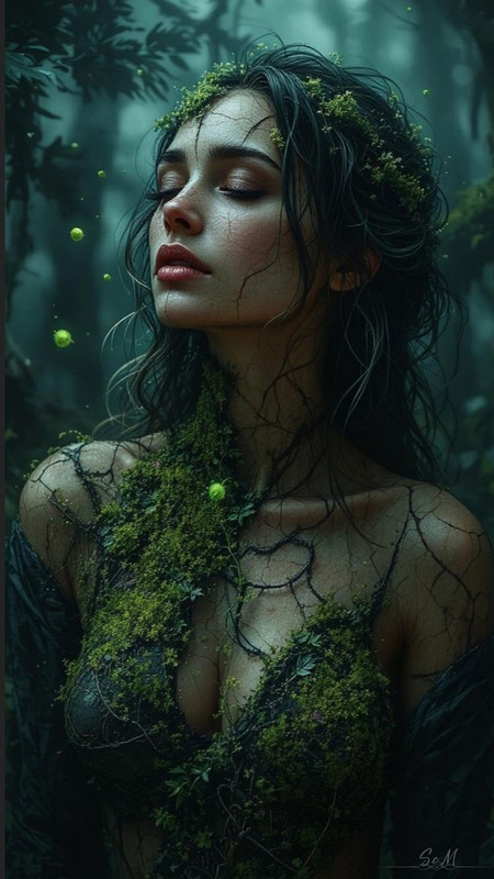 "Трава навколо їхніх ніг повільно плавилася, витягуючись догори тонкими нитками. Квіти немов зітхали, скручуючись у поклоні. Повітря замерехтіло, запульсувало, формуючись у жіночу постать.