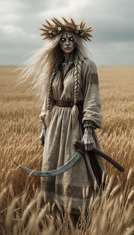 Висока, бліда, надзвичайно худа, в довгій білій сорочці, що була більше схожа на лахміття, постать з кожною секундою набувала все чіткіших моторошних обрисів - обличчя її з довгим світлим волоссям було більше схоже на вирячений череп, який вінчав красивий вінок з волошок. Худі руки закінчувались кігтями, в правій руці вона тримала серп."