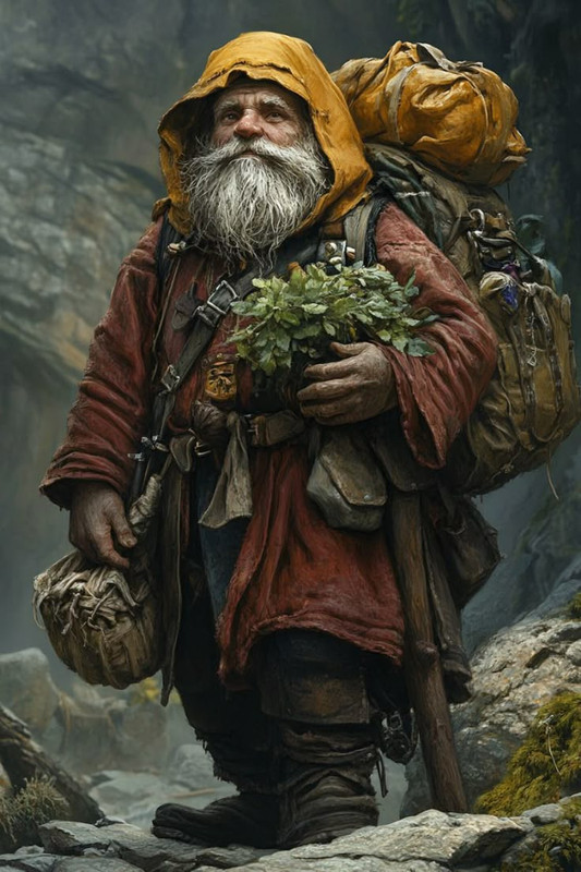 "... високого, як він, дідугана з довгими космами та такою ж бородою. Одягнений у якесь лахміття, з посохом у руці, схожим як у В’юнка, він з хитрим виразом зморшкуватого обличчя невідривно дивився на мавок. Тоді весело прогримів скрипучим голосом: