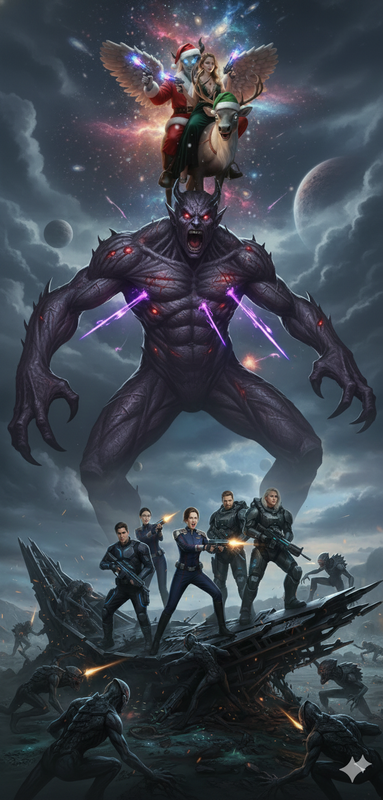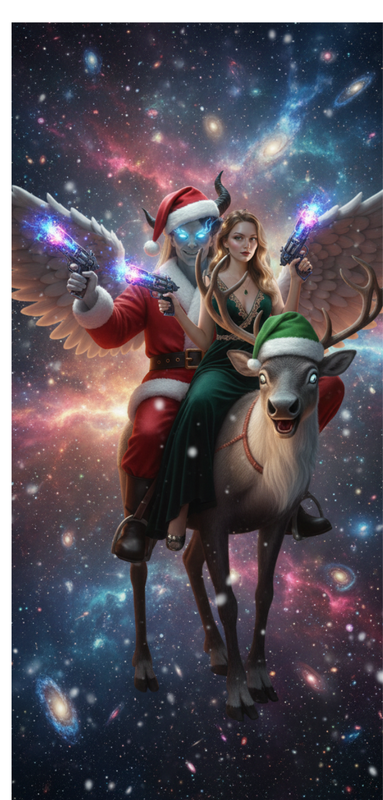Одного чудового ранку прокинулася наша Джоанна...і втратила дар мови від того, що побачила у вікно..Прямо за її вікном замість сонячного неба була космічна безодня, а майже перетинаючі межі вікна на неї дивилися двоє..Якийсь страшний янгол з рогами у костюмі санти та чарівної краси дівчина. Обидва вони сиділи на безглуздо вигдядаючому святковому олені і тримали у руках, мабуть якусь космічну зброю..