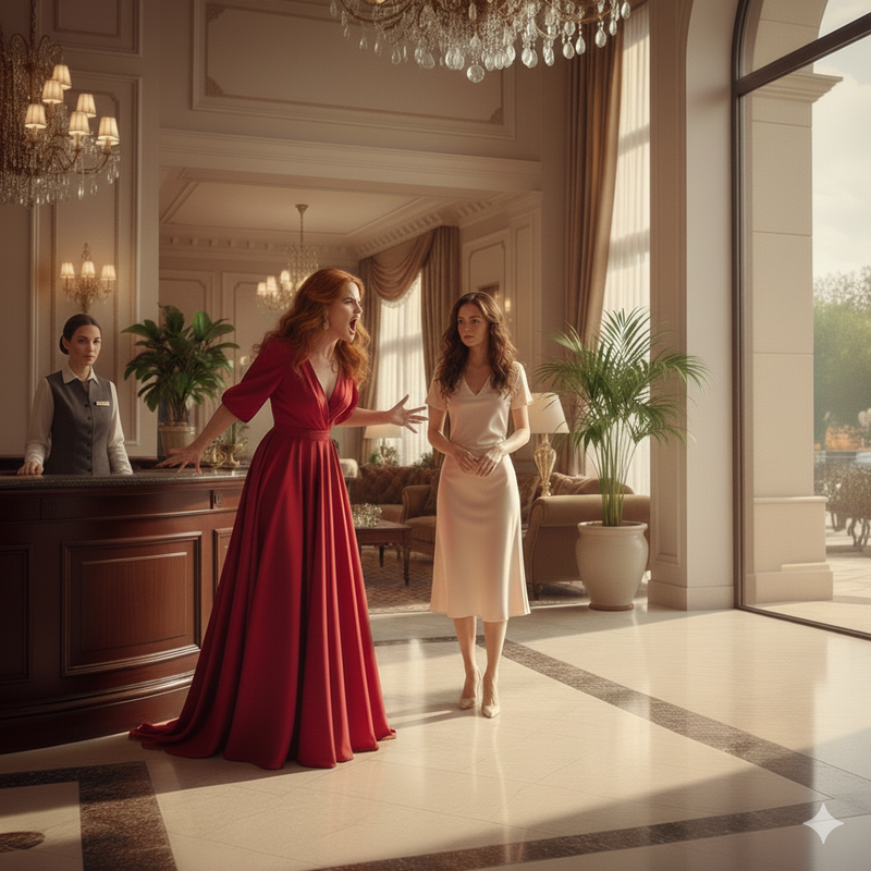 Біля рецепції стояла жінка в червоній довгій сукні. Вона була вкрай обурена й голосно висловлювала своє невдоволення.
