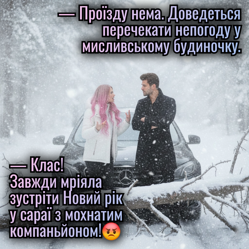 — Розслабся? — фиркнула я. — Ми застрягли в лісі, без зв’язку, навколо хурделиця, і Новий рік пішов у дупу, а ти пропонуєш мені розслабитися? Що ми будемо робити з ліжком?