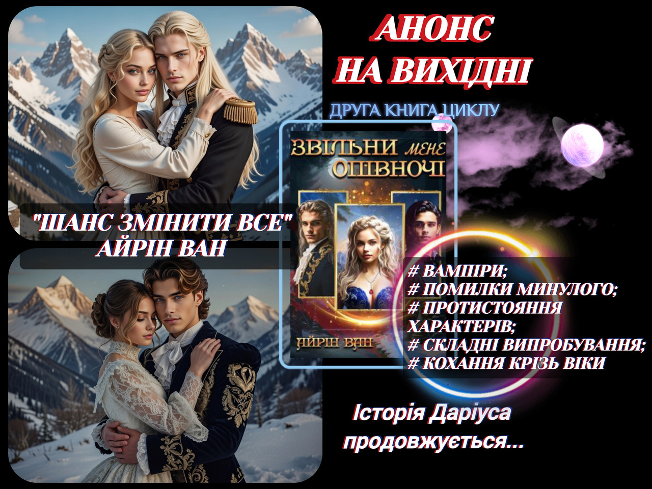 Вітаю, любі читачі, колеги й гості блогу! Я до вас з анонсом довгоочікуваної новинки у жанрі фентезі, яка з'явиться на сайті вже наступної суботи. Це друга книга циклу “Звільни мене опівночі”, перша частина якого багатьом так полюбилась. У цих книгах немає ідеальних героїв, які завжди приймають правильні рішення, адже у справжньому житті ідеальність — це тільки міф, в який так хочеться вірити. Немає легких шляхів, якими можна прийти до свого щастя. Та є складний вибір, від якого залежить їхнє майбутнє, таємниці в які не хочеться вірити, кохання, яке приходить після важких випробувань.
