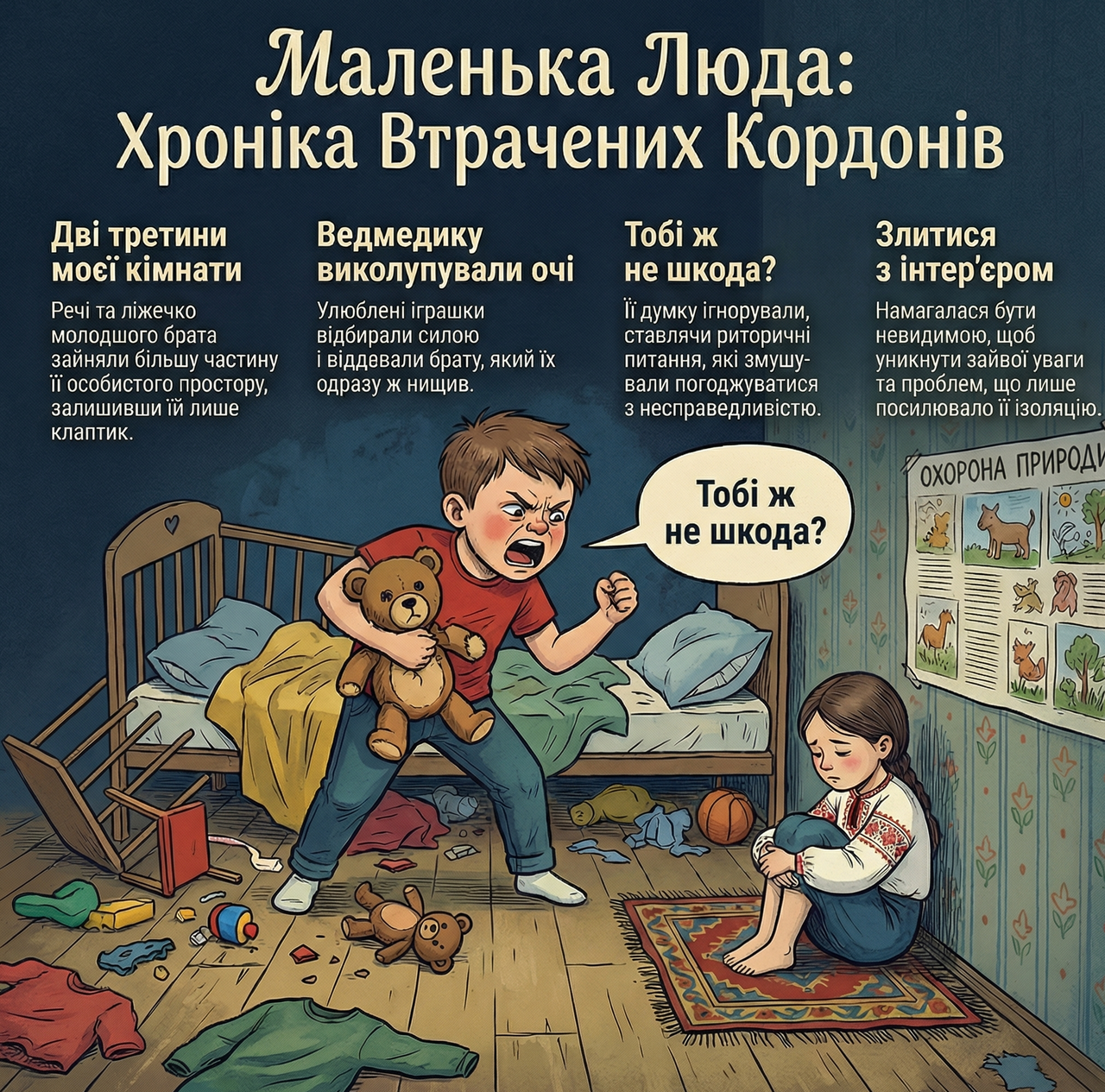 Про що ж цей "бенкет" самозречення? Перед нами постає життєпис дівчинки, яка змалечку навчилася бути "зручною". Це не просто історія про виховання, це справжня хроніка капітуляції власного "Я" перед обличчям агресивного оточення. Головна героїня, Люда, росла в тіні свого молодшого брата Василька. І тут я, як Василь, мушу зауважити: мій тезка в оповіданні — той ще фрукт! З пелюшок він "захопив" дві третини кімнати, а потім і весь життєвий простір сестри. Люда ж, як справжня партизанка, мовчки спостерігала, як виривають очі її плюшевим ведмедикам, і лише схвально кивала.