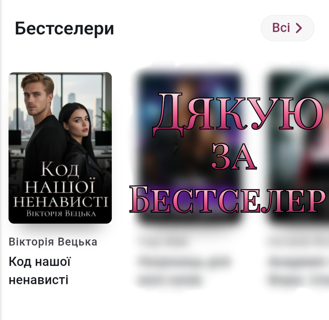 Сьогодні я прийшла до вас не просто так, а зі словами щирої вдячності. Ваша підтримка допомогла моїй книзі «КОД НАШОЇ НЕНАВИСТІ» потрапити до Бестселерів — і це для мене неймовірно багато значить. Я правда безмежно вдячна кожній із вас, хто читав, коментував, ділився враженнями й просто був поруч. Ви — моє натхнення і мої крила.