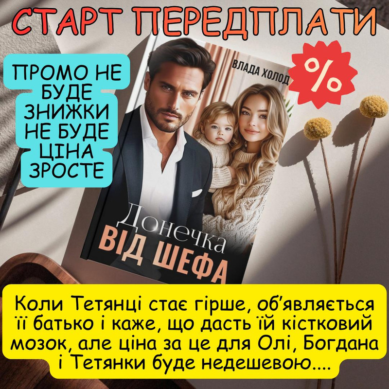 На "Донечку від шефа" Влада сьогодні відкрила передплату. Промокодів і знижок в передплаті не буде. Скоро ціна зросте. Також авторка закрила коментарі, тож щоб дізнатись, що трапилось далі, треба тільки купувати книгу) Влада обіцяє, як і завжди, завершити книгу за 44 дні і тримати вас в напрузі до самого кінця.