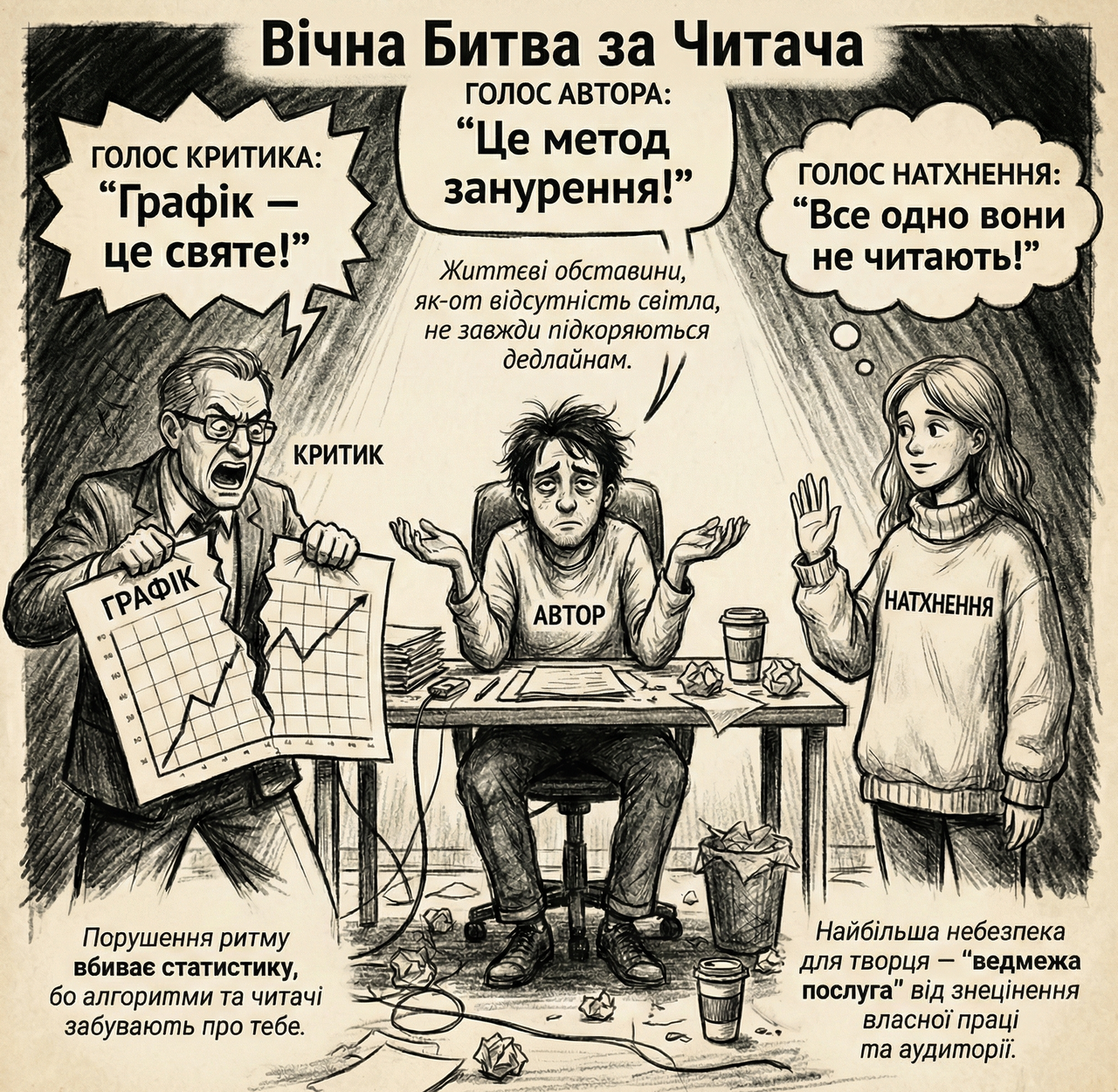 КРИТ: (червоніє) Це метод самогубства! Читача не хвилює твоє "занурення"! Читач хоче проду! Ти обіцяв регулярність, а сам зник, як той дрон-кур'єр! Ти їх обманув! Вони тепер підуть до авторів, у яких є генератори!