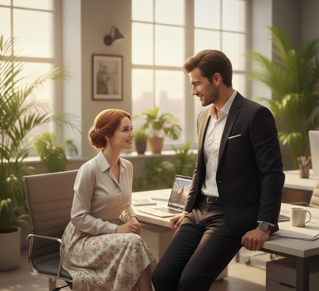 Офіс, сповнений світла, зелені та амбітних планів. І пароль на ноутбуці — «Французька», як натяк на те, що робота не буде суто діловою. Чи зможе Єва зберегти професійну дистанцію, коли директор спостерігає за кожним її рухом з таким захопленням?